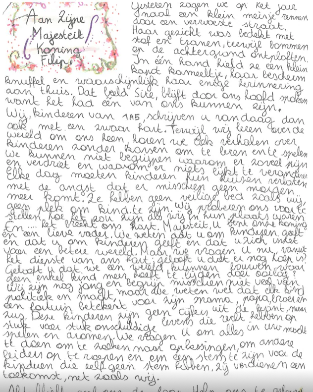 دو ماه پیش، این دانش‌ آموزان نامه‌ای سرگشاده و یک ویدئوی همراه آن به کاخ سلطنتی فرستادند تا توجه شاه فیلیپ را به رنج‌های بی‌شمار قربانیان جنگ در میان کودکان جلب کنند. بهت و حیرت آنها زمانی دوچندان شد که این درخواست شاه بلژیک را تحت تأثیر قرار داد، به طوری که این کلاس را به کاخ لاکن دعوت کرد و به آنها نقشی ویژه در سخنرانی سالانه کریسمس خود داد.